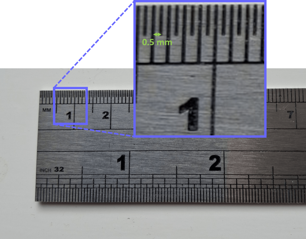 It’s a steel ruler, so most of the atoms in it are iron, and a fairly simple calculation reveals that you could line up almost 2 million iron atoms end-to-end across that small distance.