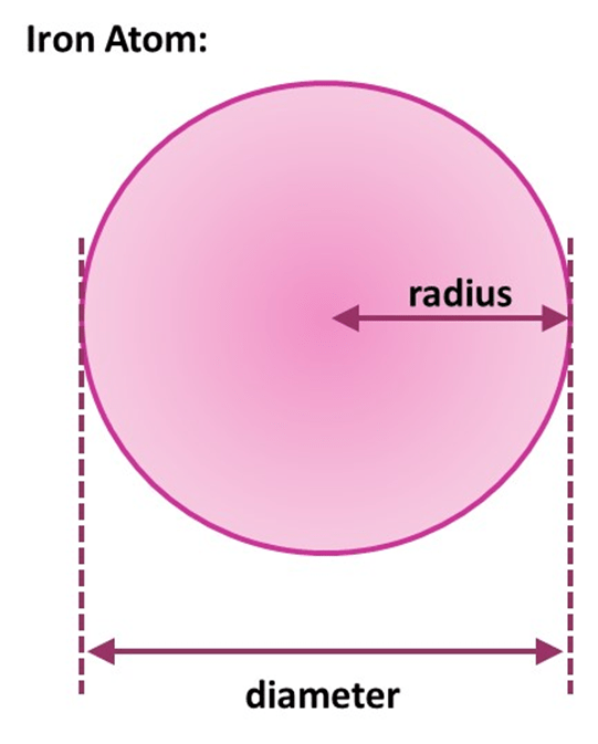 If we imagine atoms as spheres, an iron atom has a diameter of about 2.52 x 10-10 m, which is equal to 2.52 x 10-7 mm (0.000000252 mm). These are both staggeringly small and fairly awkward numbers to use and, consequently, m and mm aren’t much use when you are thinking about atoms.