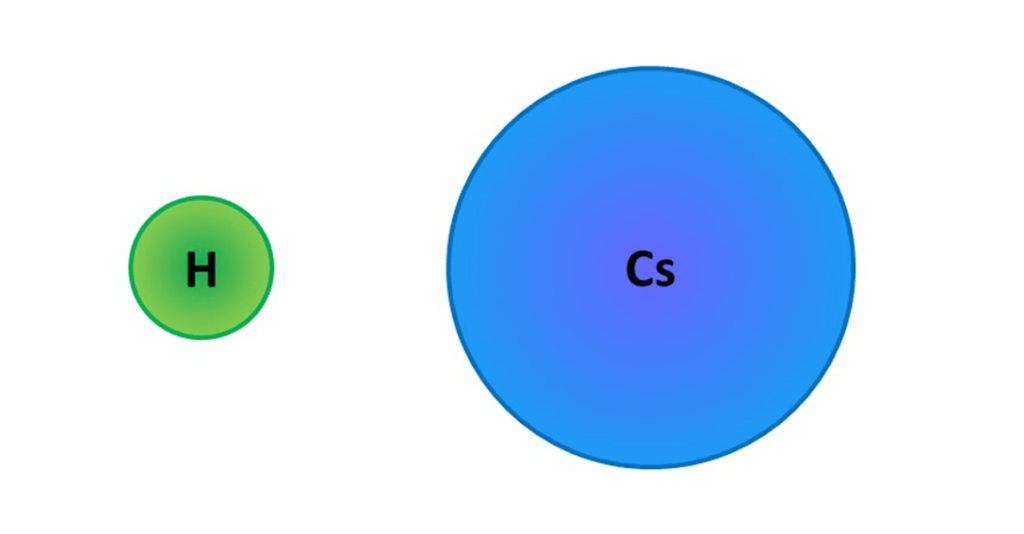 Not all atoms have the same size and there are patterns in the diameter / radius of atoms and the position of an element in the periodic table. This is a key idea in many areas of chemistry will be discussed further in later sections (links will be inserted here when available). There are also numerous different methods for measuring the diameter of atoms and sometimes average values are used, so you will not always find the same numbers quoted. I will write more about this on a later page. However, for the time being I will use something called the “van der Waals radius” which means we can imagine atoms as solid spheres and we’ll return to defining radii better in future sections (and find out that atoms don’t have hard edges anyway!). Under this system, the smallest atoms are hydrogen and helium from the top row of the periodic table, with radii of a just over 100 pm and the largest I could find measurements for are caesium and francium, caesium having a radius of 343 pm. The diagram shows the sizes of hydrogen and caesium atoms to scale: