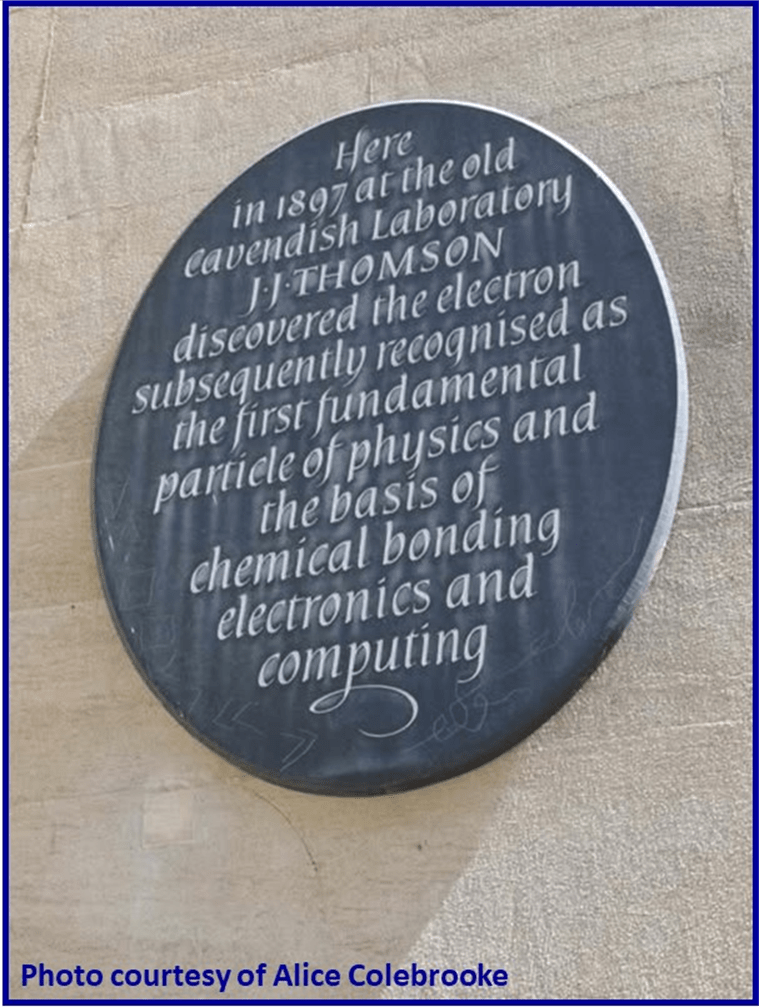 If you walk down Free School Lane in Cambridge today, past the location of the old Cavendish Laboratory (and that is often a good move because it’s relatively free of tourists) you’ll be able to see a small sign commemorating Thomson’s work. It mentions the electron as “…the basis of chemical bonding, electronics and computers“. Slightly under-stated in my opinion given not only the significance of the discovery that atoms can be broken apart into smaller things, but the fact that almost all of chemistry that has followed relies on electrons!