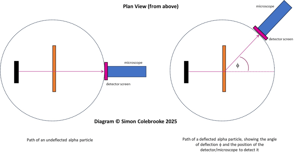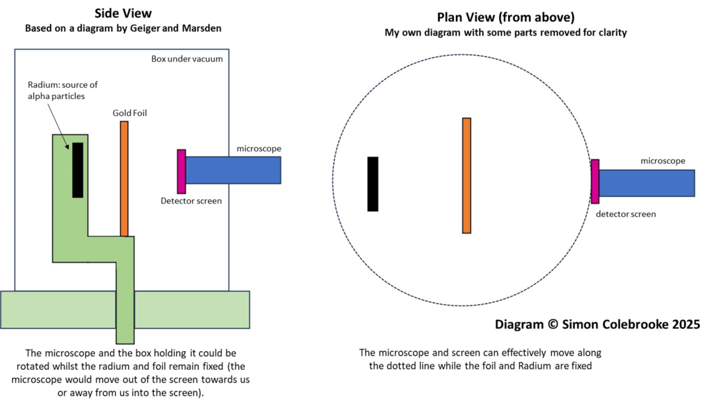 Any summary of the experiments and calculations by Geiger, Marsden and Rutherford (like this one) are likely to be over-simplifications. For a start, this was not one experiment, but a whole series of experiments where the radioactive sources, type and thickness of foil and other parameters were varied. They had to contend with many complications and think about how to account for these. For example, the alpha particles would scatter off other parts of the equipment and interfere with the count, other types of radiation from the radium sources striking the screen, having to change the width of the alpha source for low angles, decreasing decay rates over time, the challenge of observing very fast count rates, and determining the number of atoms in foils of different thickness. Rutherford’s calculations include equations that will make even the most enthusiastic maths student puff out their cheeks and pull a few faces! Here is one that you can safely gloss over in A-level chemistry, but it makes the point that these discoveries were no easy task: