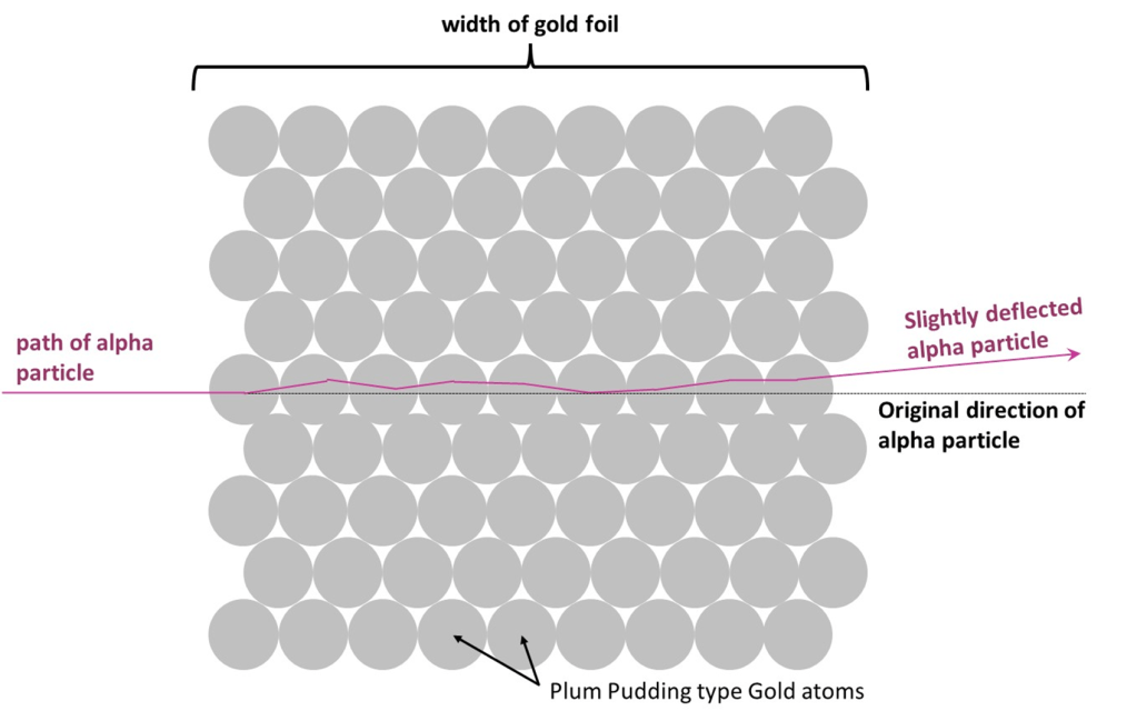 It was therefore expected that the alpha particles would only be deflected by small angles when passing through metal foils. The spread out nature of the positive charge within each atom would give rise to only small deflections and even though the alpha particles would pass through hundreds of atoms on their way through the foil, the cumulative effect would still be small.