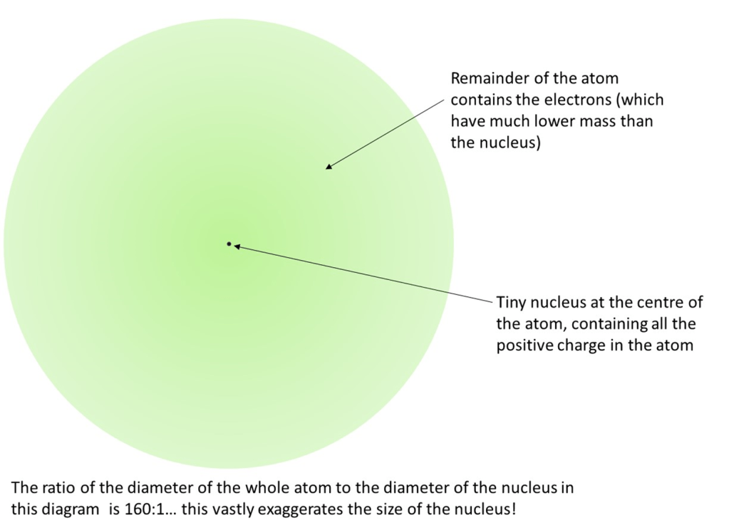 Attempting to explain these results, in 1911, Rutherford carried out some calculations to determine how likely it was that an alpha particle would undergo a large overall deflection by interacting with several atoms (one after another) as it travelled through the metal foil. He decided it was so unlikely that it was effectively impossible. Instead, he proposed that the large deflections arose from an alpha particle interacting with only one of the gold atoms it encountered on its’ way through the foil. However, for such large deflections to occur from one interaction only the atom must contain a region with very high electric field; all the atom’s positive charge must be concentrated in a tiny “nucleus” the diameter of which is much smaller than that of the gold atom overall. This was the end of the Plum Pudding model as it was inconsistent with these new experimental results. The negative charges (electrons) would then be spread somehow through the rest of the atom. Given that electrons were already known to be very much smaller than atoms, this meant – that remarkably – atoms were mostly empty space!