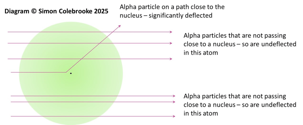 Since an atom is mostly empty space, most of the alpha particles never get anywhere near a nucleus, and this accounts for the large numbers of alpha particles that go straight through the foil with minimum deflection.