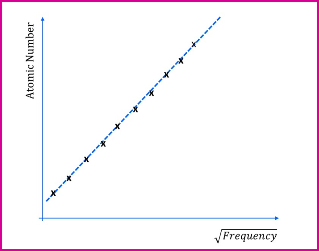 Henry Moseley worked in the same physics department as Ernest Rutherford at the University of Manchester. In 1913 he published a paper describing the results he obtained when a stream of high energy cathode rays (recently shown to be electrons by JJ Thomson) was directed at a range of different elements. Like other scientists had done shortly beforehand, he found that the elements emitted X-rays and he measured the frequencies of these X-rays as he varied the element and, hence, the atomic number. In 1913 he tried this for the 11 elements from calcium to zinc and in 1914 extended this further to around 40 elements in total. He found that when the atomic number of the element was plotted against the square root of the frequency he obtained a straight line, something like this simplified version below:
