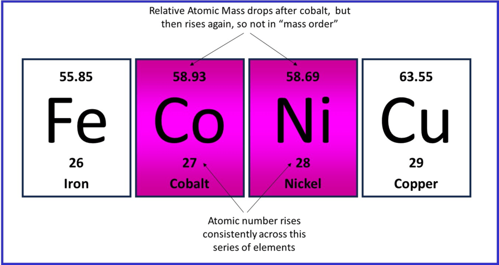Interestingly, this development in understanding about atoms neatly resolved a discrepancy in the ordering of elements in the periodic table. For sometime cobalt and nickel had been placed out of atomic mass order, so as to keep the chemical properties well matched; cobalt had a slightly higher atomic mass than nickel. However, once atomic number was known to be the key feature of an atom by which they should be ordered, cobalt should come before nickel based on the X-ray frequency emitted.