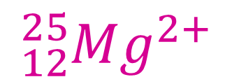 This species also has the atomic number 12 (hence 12 protons) and a mass number of 25 (hence 25-12 = 13 neutrons). However, there is now an overall 2+ charge. This is a positive ion and so the number of protons must exceed by two, the number of electrons. Since we already know there are 12 protons, there must be 10 electrons.