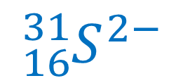 The number of protons decides the element; 16 protons means sulfur. We therefore know the element symbol to use (S) and the atomic number. The mass number is the sum of the neutrons and protons; in this instance, 16 + 15 = 31. Finally, we need to decide if there is a charge. The number of electrons exceeds the number of protons by 2; hence there will be a negative charge of 2- as the negative charge of the electrons will exceed the positive proton charge. Hence this is a sulphide ion and the nuclear symbol of this species will be: