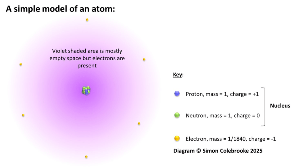 Diagram 1: A simple model of an atom showing the relative locations of protons, neutrons and electrons. Remember that in this diagram, the size of the nucleus is hugely exaggerated !