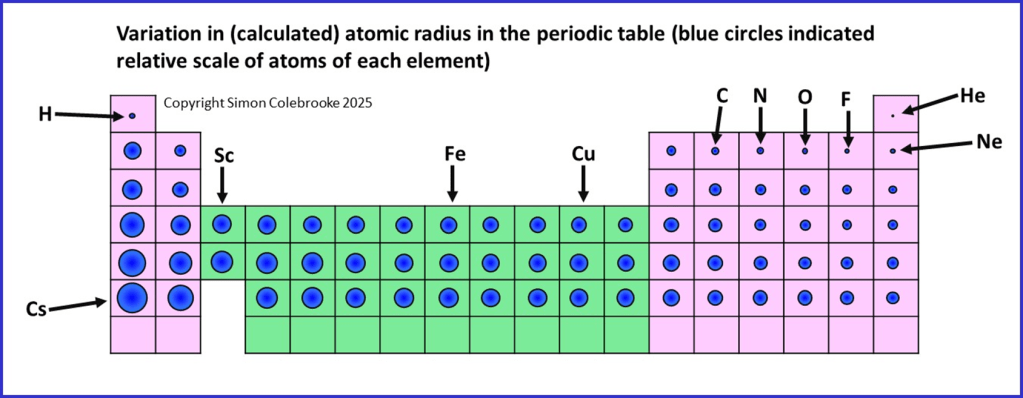 The outcome of these trends mean that we will find the largest atoms towards the bottom left-hand corner of the periodic table and the smallest atoms towards the top right corner. I have tried to illustrate the variations in the calculated atomic radius on the period table below, where the blue circles representing each atom are drawn to scale. A few specific elements have been indicated, but most are not for clarity.