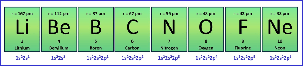 There is a very common misconception that many students have at the start of A-level, so let’s start by thinking about why it is wrong. The misconception is that “atoms get larger as you go along a period in the periodic table“. That would mean if we look at period 2, fluorine atoms would be larger than lithium atoms, because they have the larger atomic number and are further along the period. That doesn’t sound so unreasonable does it? Why wouldn’t that make sense? I mean, fluorine atoms have more protons, neutrons and electrons than lithium atoms, so of course they’re larger? But just look at the data in the figure below for the elements in period, where the “r” values give the calculated radius in picometres: