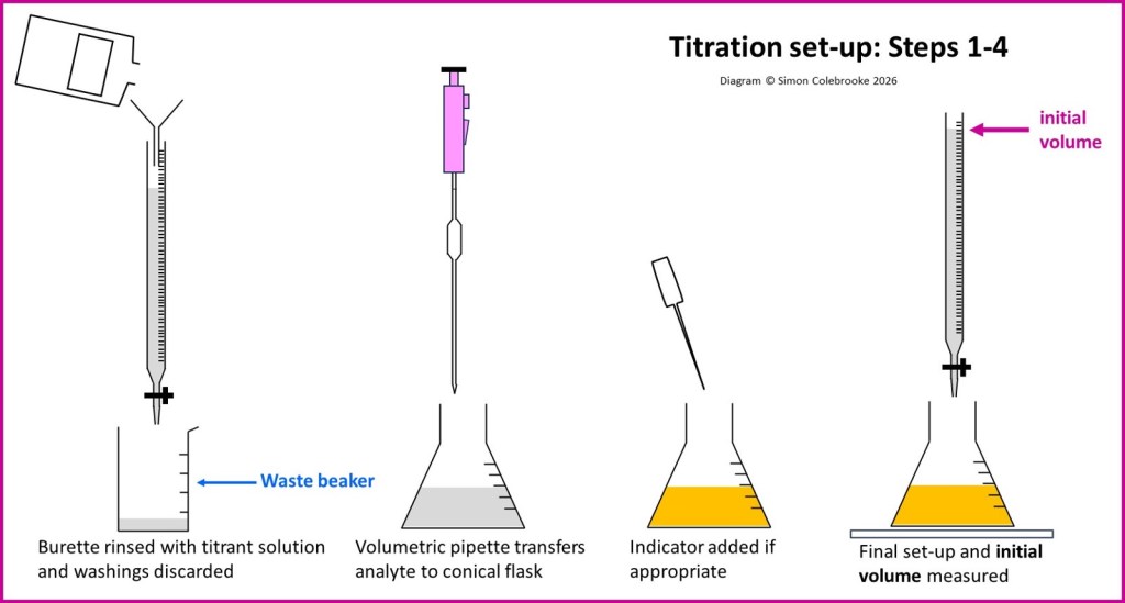The first of a series of pages on titrations has been published. This first one describes the essential features of all titrations, without getting too burdened with stages from specific titrations. Read this page by clicking here and find out about titres, procedural steps and reasons behind some of those steps. Subsequent sections will look at acid-base titrations, iodine-thiosulphate titrations etc.