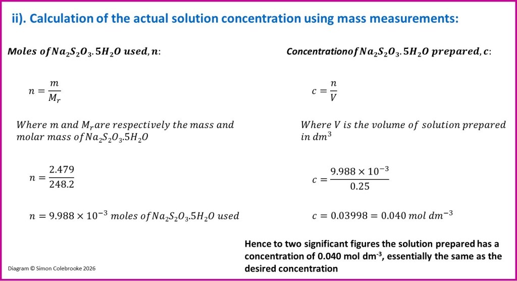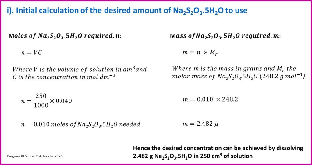 However it is important to think about the formula of the hydrated salt before starting the calculation. The crystal lattice of a hydrated salt includes some water molecules. This is different to the crystals being “wet” on the surface, the water is actually incorporated inside the crystal amongst the sodium and thiosulphate ions. So when we determine the mass of hydrated sodium thiosulphate used we have to remember that water constitutes some of that mass; hence we must use the entire molar mass of the hydrated salt including the “.5H2O”. Hence the Mr value for the calculation is 248.2 (for Na2S2O3.5H2O) and not 158.2 (for Na2S2O3 only). When the solid dissolves and the lattice breaks up, the water molecules in the “.5H2O” go off to become part of the water in the solution, but they are still present when the solid is weighed.