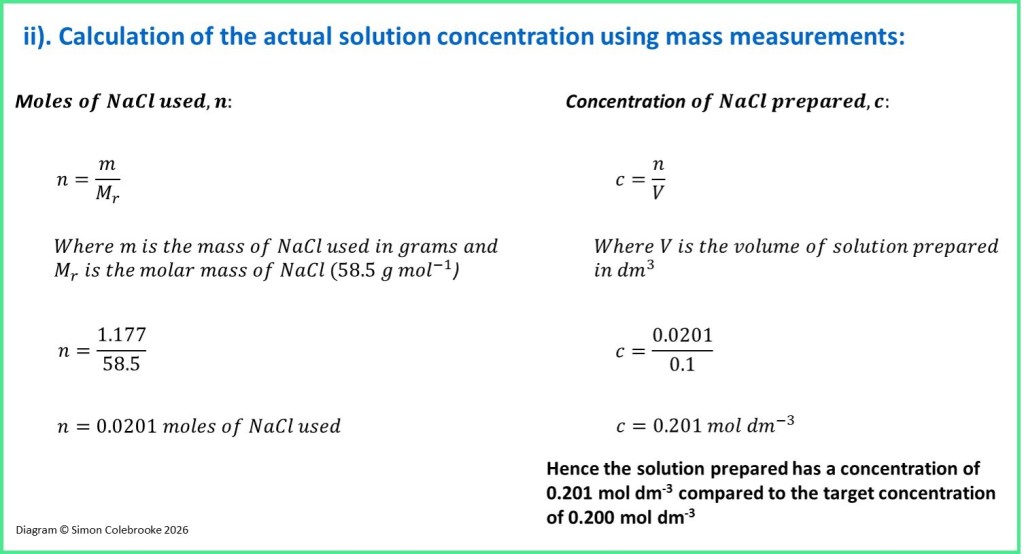ii) Having measured exactly how much NaCl is used in the preparation of this solution, follow the steps outlined in the procedure described previously to obtain 100 cm3 of solution in a volumetric flask. It is now possible to calculate the concentration of the solution actually prepared, as shown in the box below: