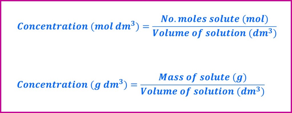 Concentration means “amount of solute per volume of solution”. The most commonly used used units are mol dm-3 (moles of solute per decimetre cubed of solution) and g dm-3 (grams per decimetre cubed of solution). Although other sets of units are used as well (simply change the quantity that the amount or volume are measured in), they are all essentially the same thing – an amount of solute divided by the total volume into which it is dissolved.