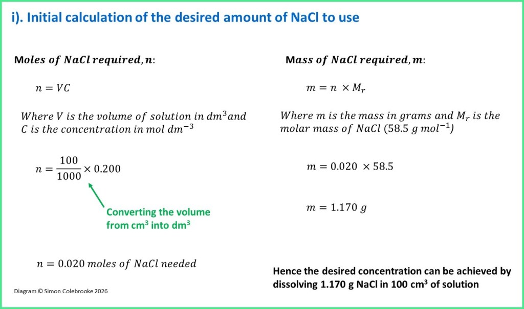 i) We need an initial calculation to determine the mass of sodium chloride to dissolve. This is obtained by some relatively simple calculations, based on equations linking moles, volume and concentration and also moles, mass and molar mass. First, we calculate the number of moles of NaCl needed, based on the concentration and volume of solution required. We then use that result to calculate the corresponding mass of NaCl. All the steps are shown in the box below: