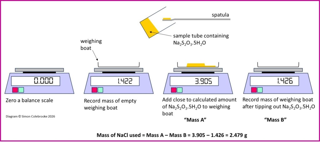 Given the method described in the previous sections it is not realistic to measure a mass of 1.170g and know for certain that it has all been transferred into the solution. Apart from anything else, it would take too long to add the correct amount of NaCl to the weighing boat at the third decimal place – we’d constantly be adding too much, then trying to remove a bit, only to take off too much and have to add more again! Instead, masses are measured by difference, with approximately the correct mass added to a weighing boat and, once the solid has been tipped into a beaker, the mass of the weighing boat recorded again with the difference between the two measurements equalling the mass added to the beaker. This accounts for miniscule amounts left on the weighing boat…. And it’s much faster!